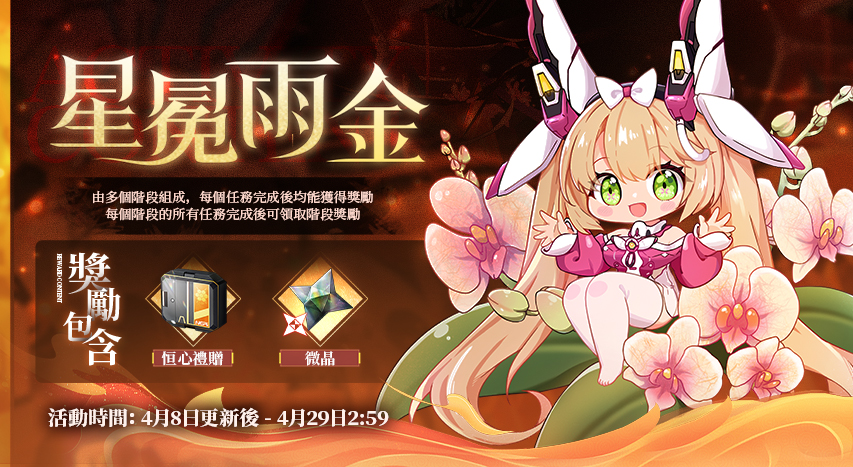 活動內容:「星冕雨金」內含七個階段的挑戰任務,且七個階段會同時開放。總隊長在活動期間內完成各項挑戰任務,即可獲得「恒心禮贈」、微晶等豐厚獎勵。